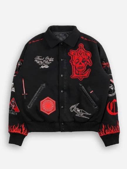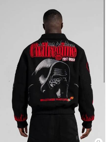 Crafted in classic varsity style, this jacket blends heavyweight wool-like fabric with faux leather sleeves for a modern twist. Check out latest collection of civil regime jacket. The Civil Regime Kylo Ren Letterman Jacket is made for bold and modern style. The front snap closures, striped ribbed trims, and embroidered detailing create a sharp look inspired by iconic storytelling. Comfortable yet rugged, it layers easily over tees or hoodies. Perfect for those who want a timeless piece with a strong cultural reference, built for statement wear.